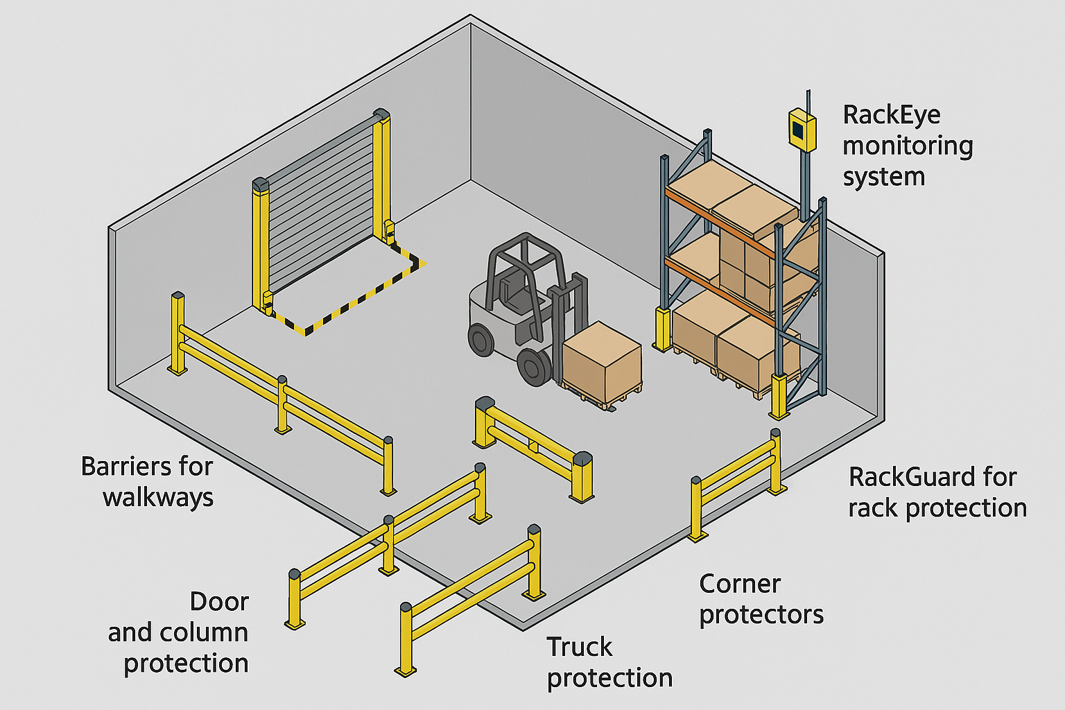 Unngå påkjøringsskader på dør, porter, reolender og hjørner med robuste barrierer i polymer.