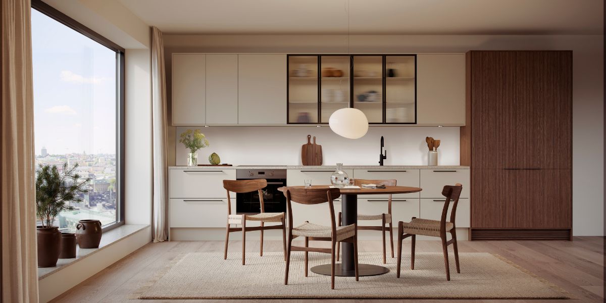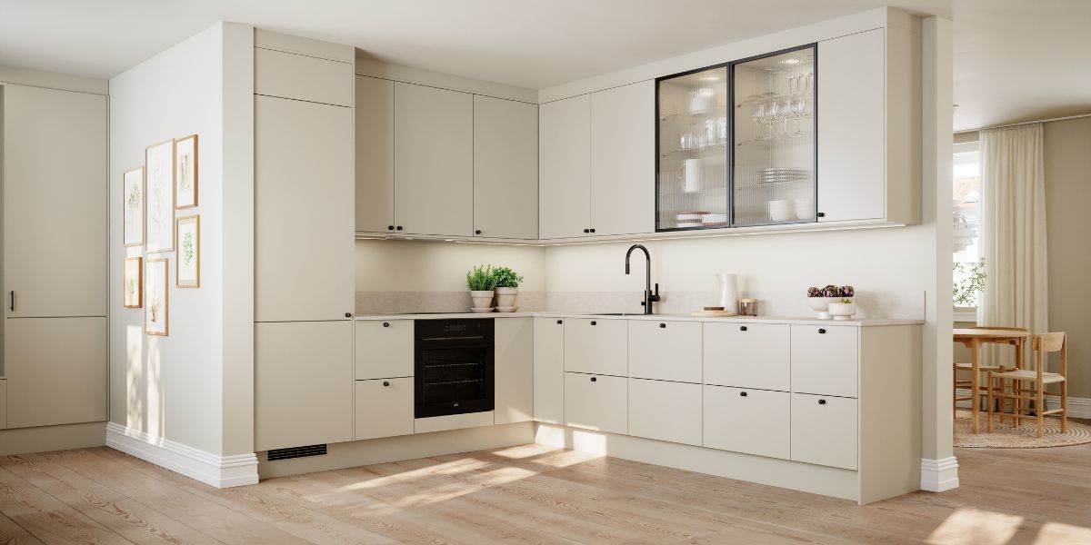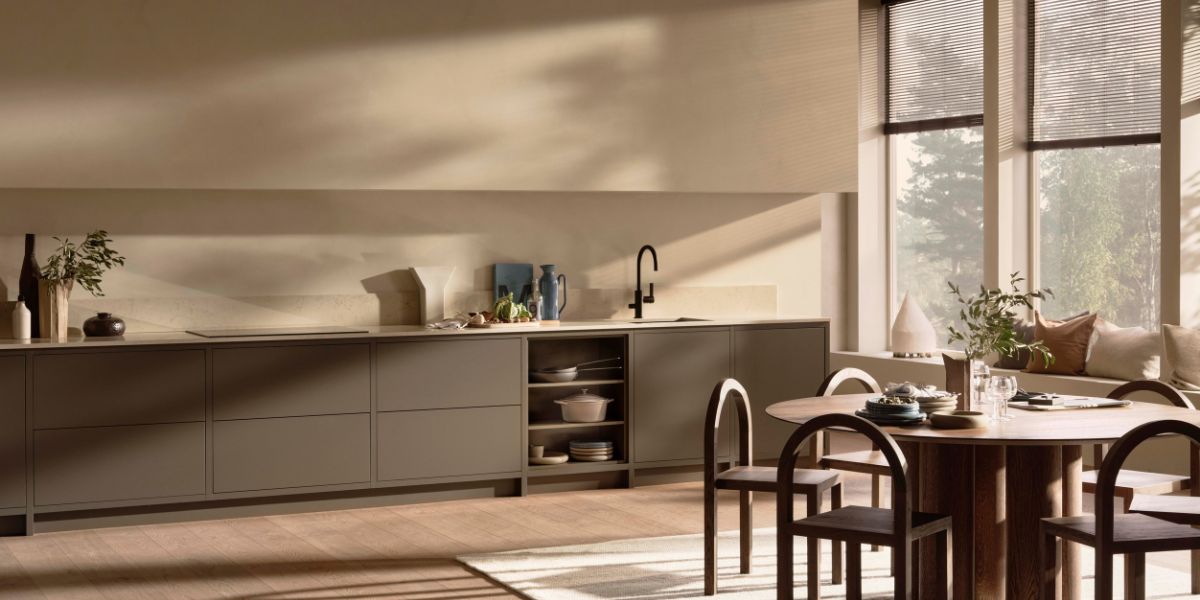 Her ser du kjøkkenmodellen Line Inframe i fargen Høst. Dette bildet er fra konseptet Varm Minimalisme utviklet av Lotta Agaton.
