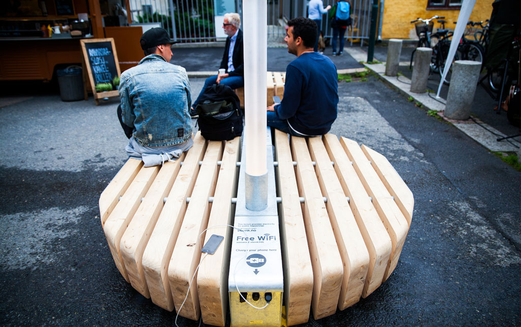 Den gamle telefonkiosken er død, men på denne e-benken kan du surfe og lade mobilen så mye du vil. Foodtrucks kan få strøm, det er lys og gratis wifi - og med konserttillatelse kan man til og med plugge inn høyttalere og mikrofon.