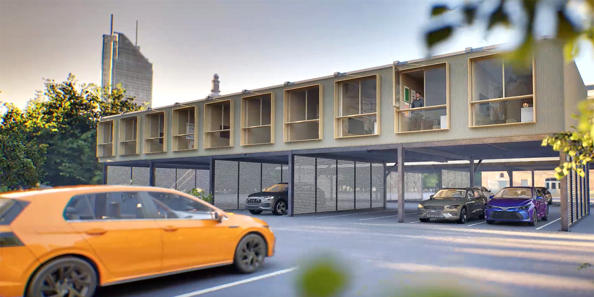 Med kompakte, modulbaserte leiligheter på stålkonstruksjoner kan man utnytte ubrukt plass på parkeringsplasser. Alt kan enkelt settes opp, flyttes eller tas ned igjen etter behov.