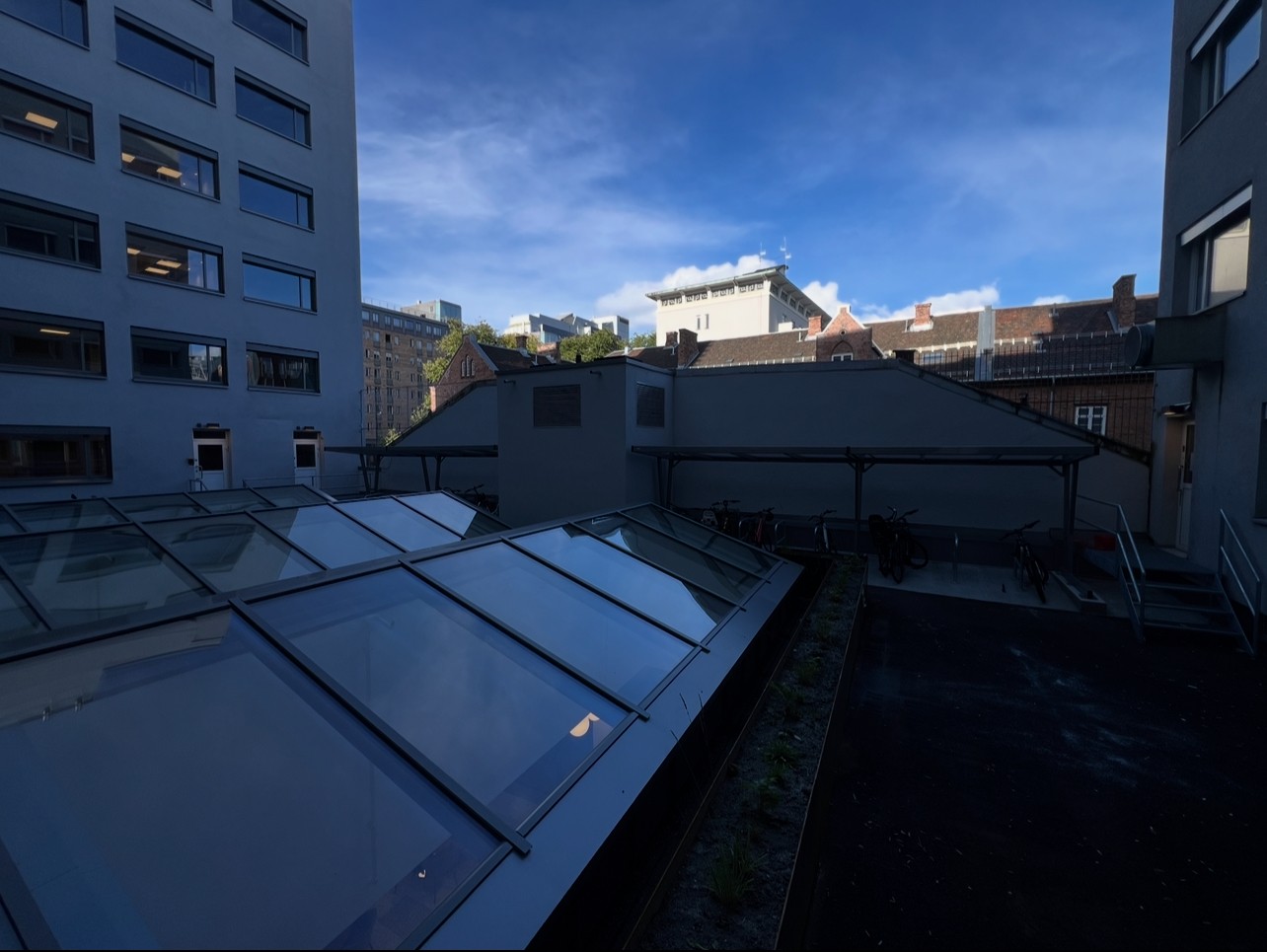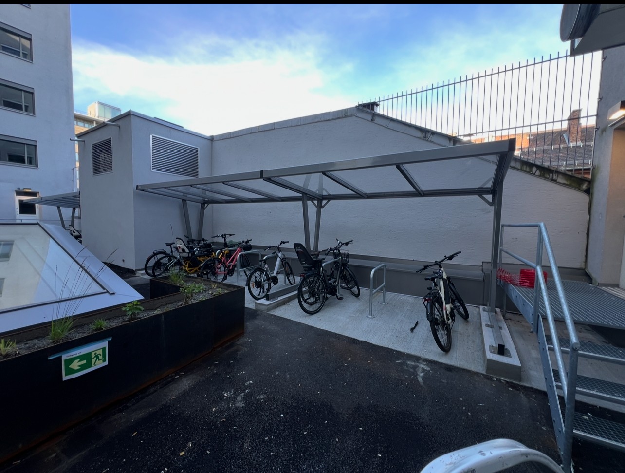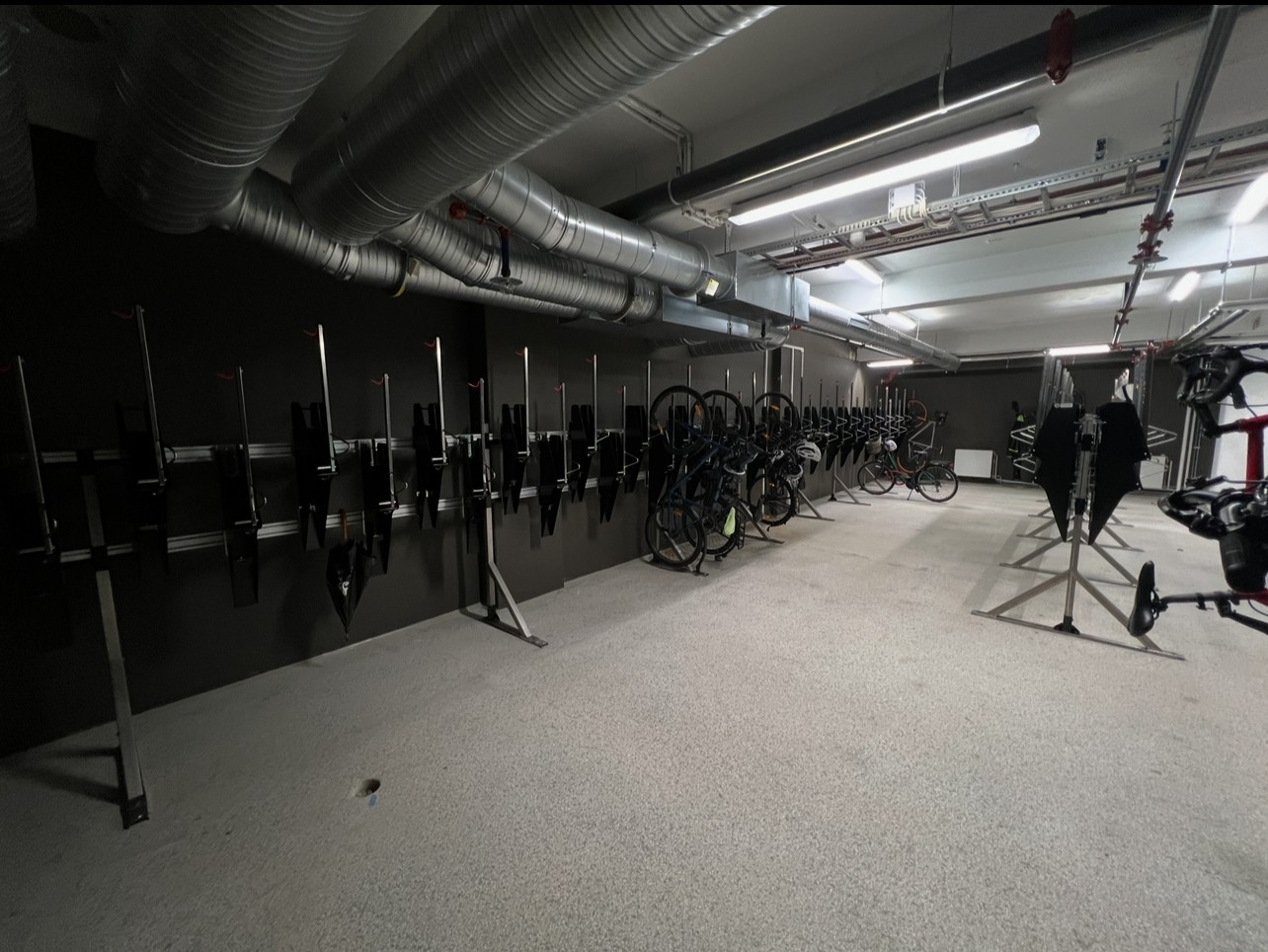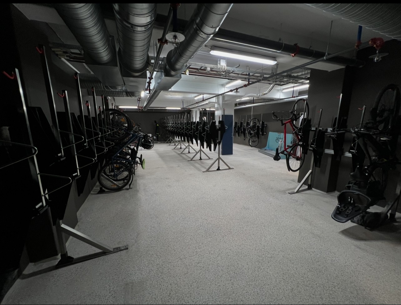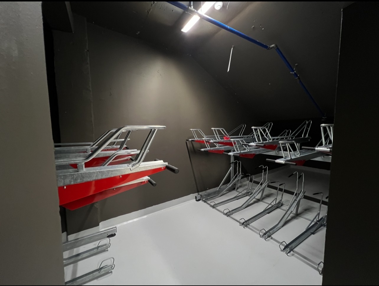 Sykkelparkeringsfasilitetene ute er oppgradert med 2 stk Wave-sykkeltak med Linus A bøylestativer. Inne er det funksjonelle og moderne sykkelstativer; to etasjes stativ 2ParkUp og vertikal parkering VelowUp.