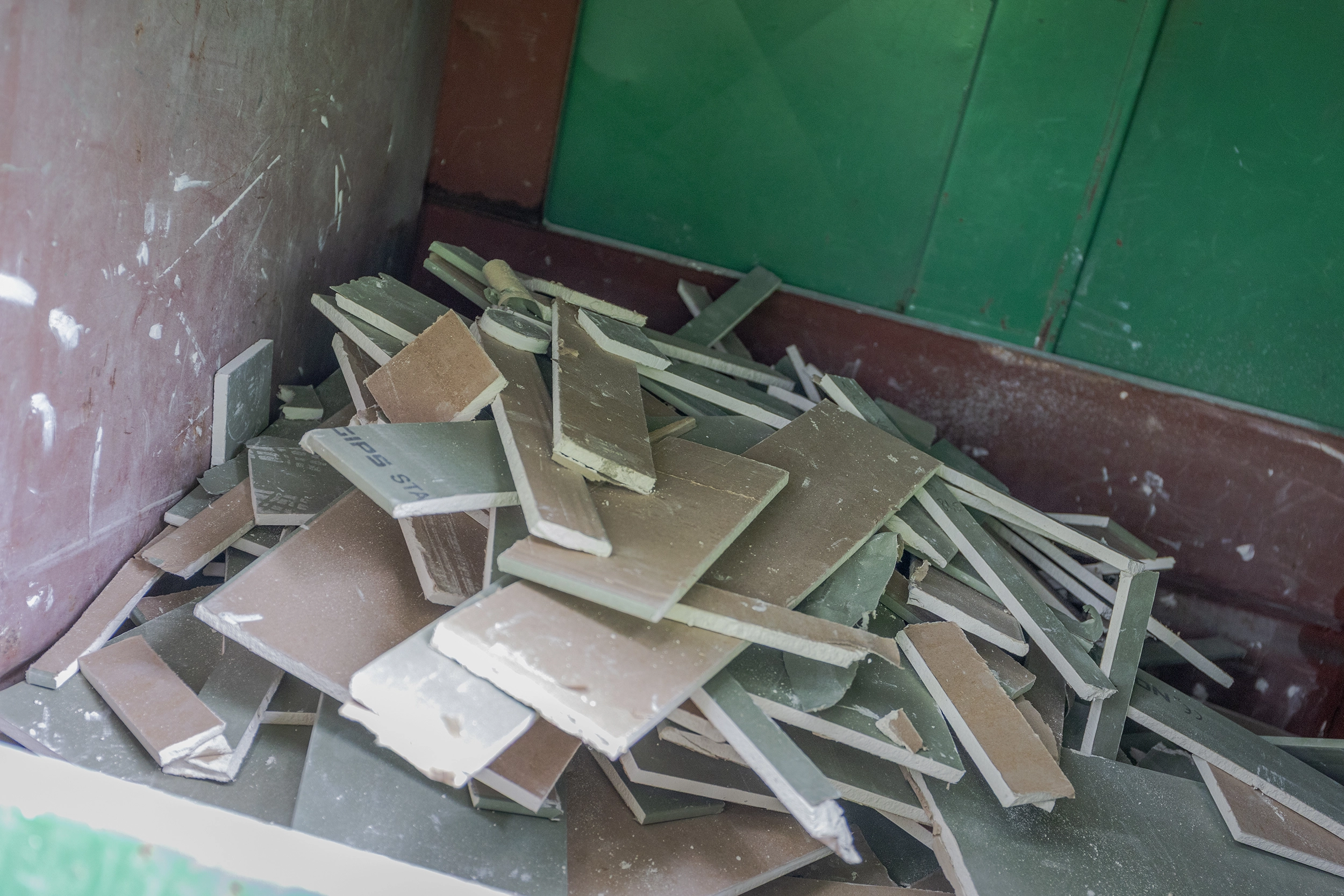 New West – Den Sirkulære Gipsfabrikken fjerner kartong, maling, tapet, skruer, spiker, og beslag fra gipsen før de sender gipsen tilbake til gipsfabrikken for produksjon av nye plater.