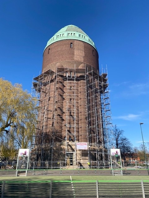 ABC Ställningar i Malmö har fått i oppdrag av Team Skåne AB å sette opp et stillas for å muliggjøre fremtidig renoveringsarbeid på vanntårnet, et av Malmös arkitektoniske mesterverk.