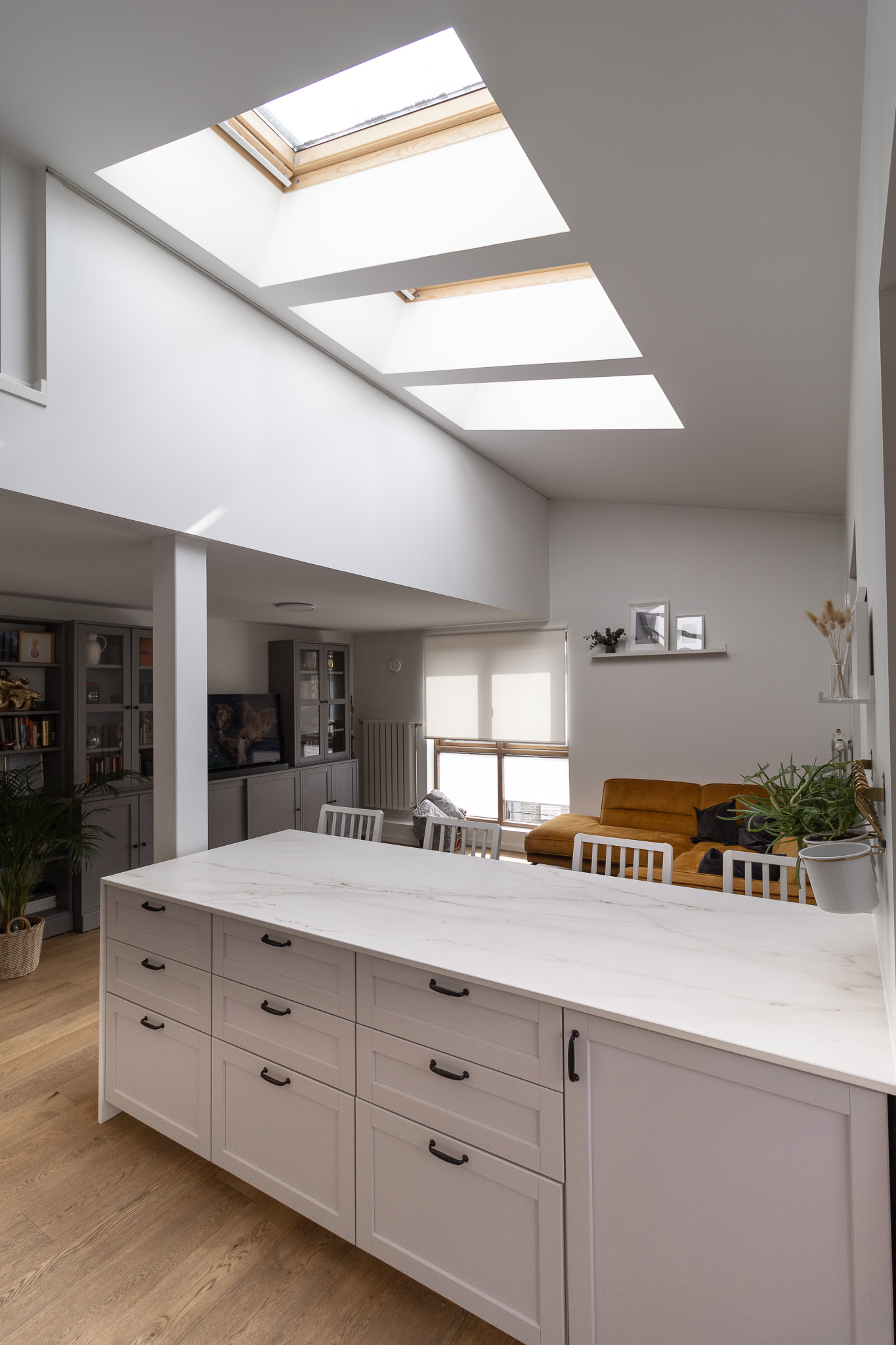 For å legge til mer arbeidsflate og åpne opp rommet, ble det installert en stor kjøkkenøy med keramisk benkeplate Dekton Rem. Overflaten ser ut som naturlig marmor, men er langt mer slitesterk.