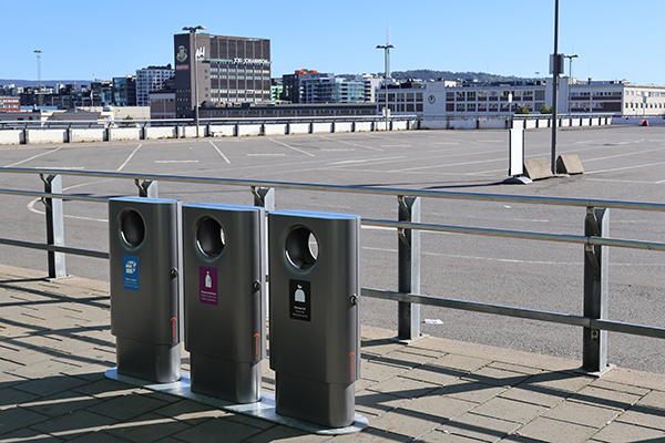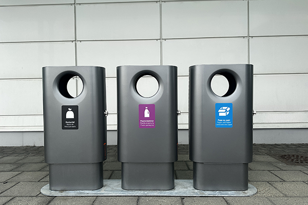 Som de andre variantene av Konsis avfallsbeholdere leveres disse med innvendig sokkel og låsbart skrog. Den kan brukes både innendørs og utendørs.