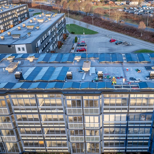 Ikke bare har Bjørgene 1 fått innglassete balkonger med integrert varmepumpe, etterisolering og nye fasader og nytt tak. Det er lagt solceller på takene som kan produsere 220 000 kilowattimer årlig, nok til å drifte varmepumpene og kanskje også deler av annen felles strøm i borettslaget. Styreleder Asbjørn Skogland i Bjørgene 1 sier det ganske enkelt: