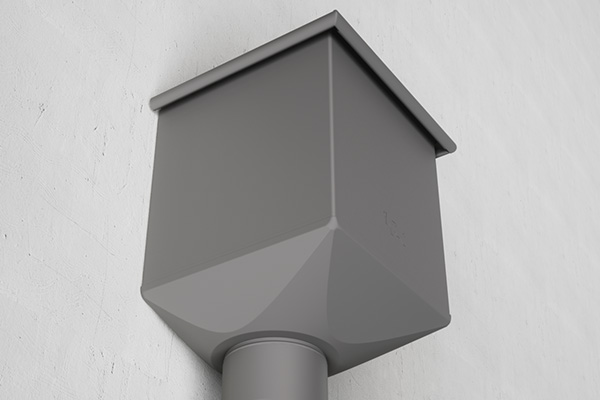Fra 2026 lanserer PREFA samlekum i revidert design. Bunnplaten er harmonisert og tilpasset både modellen med rund avløpsstuss og varianten med firkantet nedløpsrør.