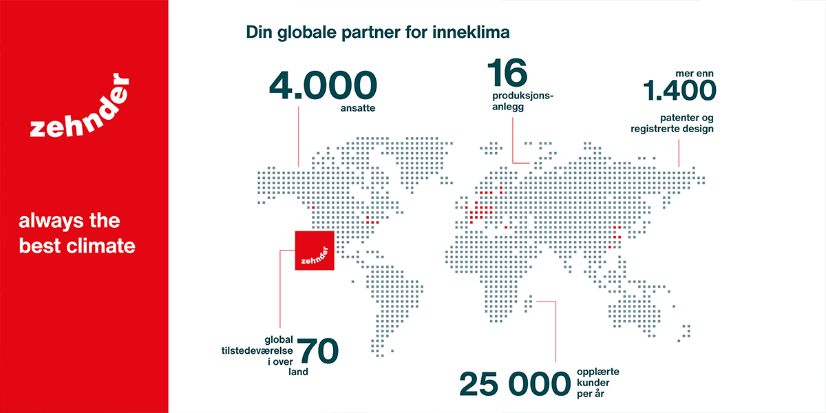 Exvent AS har vært en del av Zehnder Group siden 2018. Zehnder er en ledende global leverandør av komplette løsninger for et sunt inneklima. Hos Zehnder streber vi etter å forbedre livskvaliteten ved å tilby de beste inneklimaløsningene. Vår misjon er å levere et sunt inneklima med løsninger av høyeste kvalitet. Oppholdsrom holdes på en behagelig temperatur av våre radiatorer og varme- og kjøletak, mens våre ventilasjonsløsninger sørger for at du kan puste inn frisk, ren luft – døgnet rundt.