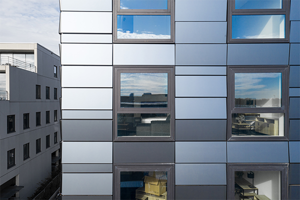 De energiproduserende solcellefasadene på Student Experience Minervahaven i A...
