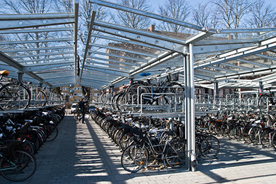 I hver etasje parkeres syklene i vekselvis lav/høy posisjon. Dette gir ett redusert plassbehov uten at syklene kommer i konflikt under parkering.