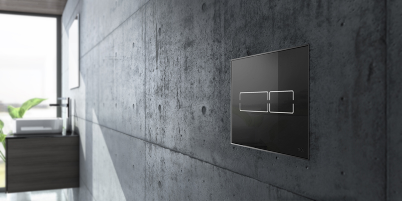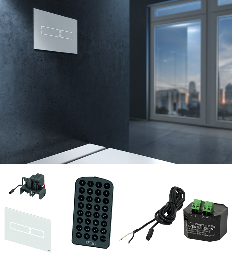 TECElux Mini er en ny elektronisk, glass betjeningsplate for TECE sisternen. Spylingen er berøringsfri eller ved hjelp av et lett trykk på betjeningsplaten. Avstandssensoren registrerer når en person nærmer seg toalettet og aktiverer belysning av knappeområdet, i tillegg fungerer lyset som en orienteringshjelp i mørket.