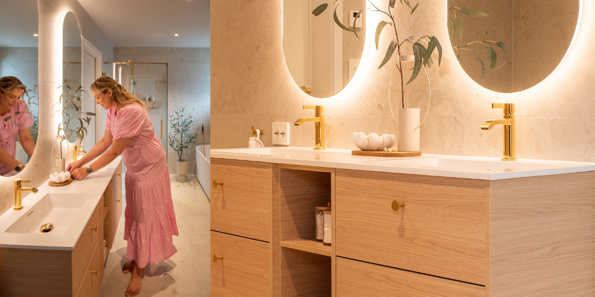 Hun valgte serien Innovent i utførelsen Lys Eik, en spesialtilpasset løsning med dobbel servant og åpne hyller i midten. Løsningen gir både estetikk og oppbevaringsplass – og gir rommet en harmonisk og åpen følelse.