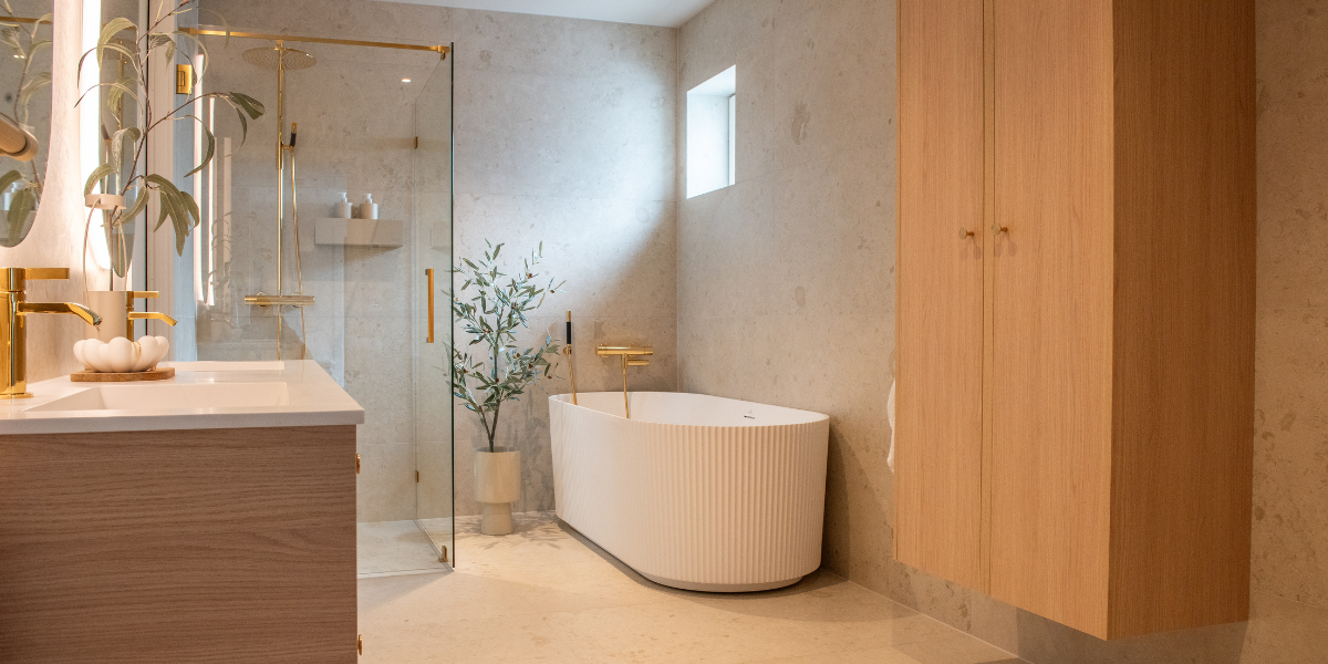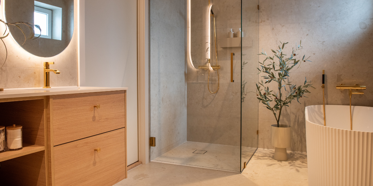 Med skreddersydde løsninger, nøye utvalgte materialer og sans for detaljer har Therese og Øivind forvandlet et slitent bad til en rolig og stilfull sone i hjemmet.