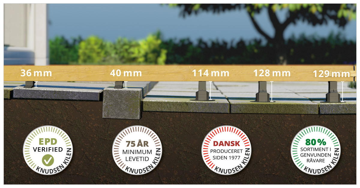 Knudsen Kilens terrassesystem brukes til oppklossing av terrasser av tre eller kompositt og kompenserer enkelt for ujevne eller skrånende overflater, slik at du oppnår en jevn og tiltalende terrasseoverflate. Terrassesålen stabiliserer oppklossingen og beskytter såbare flater som takpapp.
