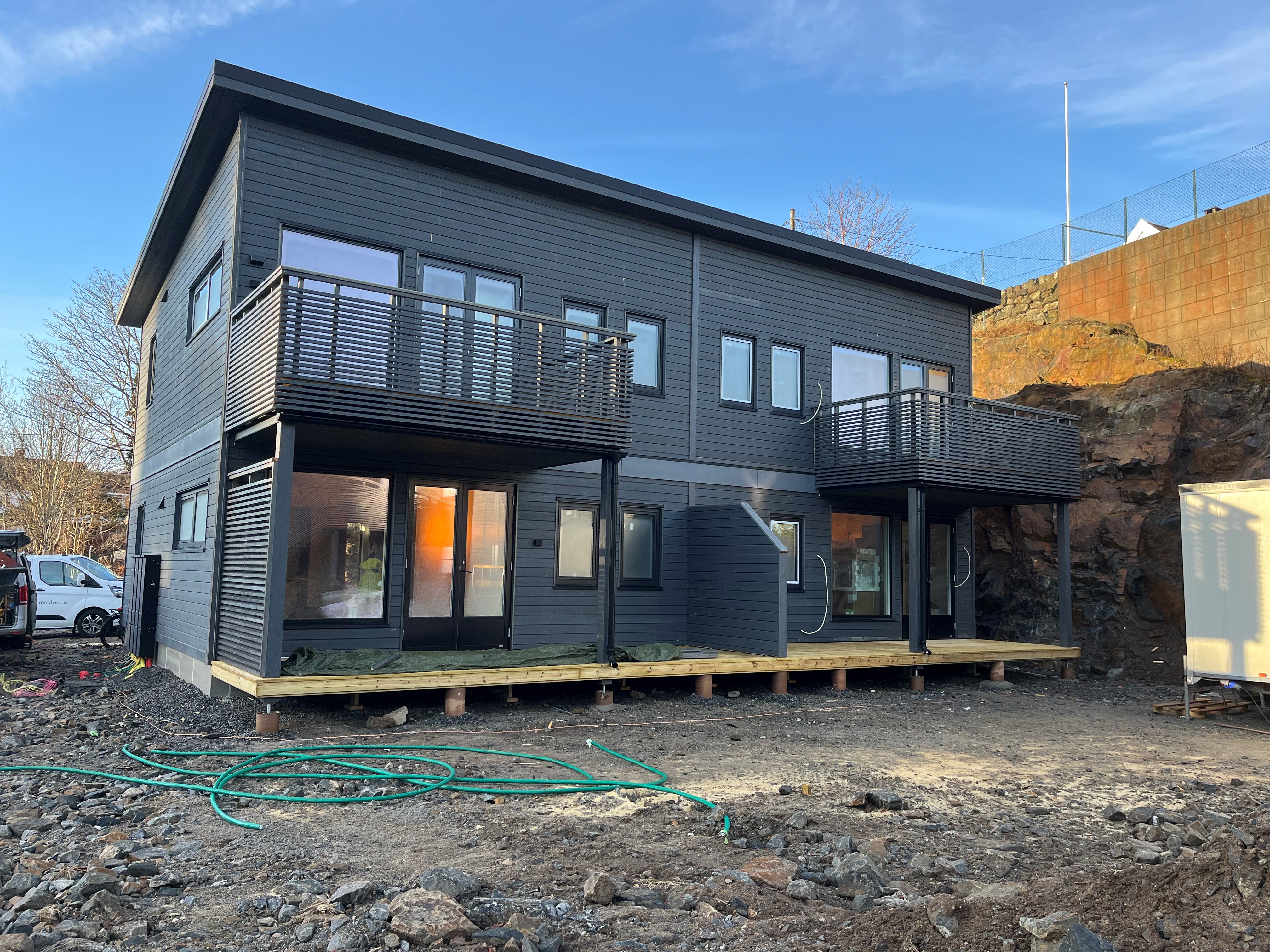 På Risør Platå har vi nå levert den første 4-mannsbolig i prosjektet, som stod ferdig utvendig på under tre uker! Ytterligere to bygg skal leveres utover i 2026. Prosjektene utføres i samarbeid med Huscompaniet, som vi har hatt et langvarig og godt samarbeid med. Leveransen omfatter ferdige elementer med høy ferdigstillelsesgrad, og i tillegg til levering og montering, vil NBS Norge også stå for ferdigstillelse av de innvendige arbeidene.