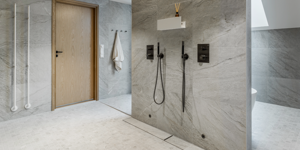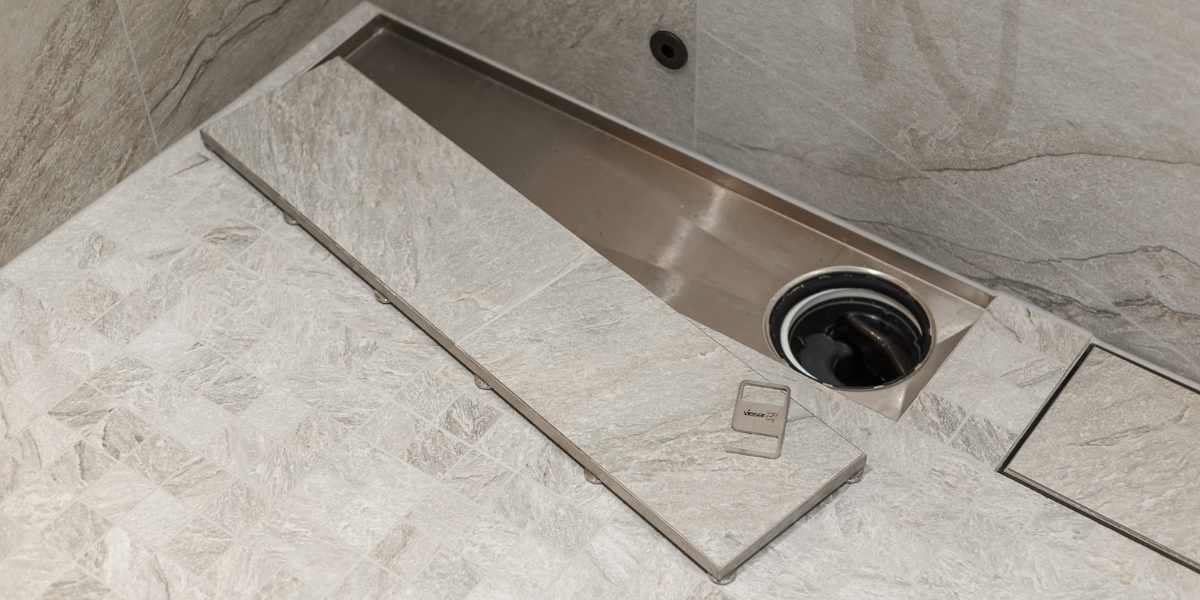 Til leilighetenes baderom ble det valgt praktiske og elegante løsninger, inkludert Vieser Line linjesluk. Slukene smelter fint inn i det elegante gulvet, som ble valgt i henhold til tre interiørtemaer: Arkki, Fontti og Kolumni – enten mørke og dramatiske eller lyse og diskrete fliser.