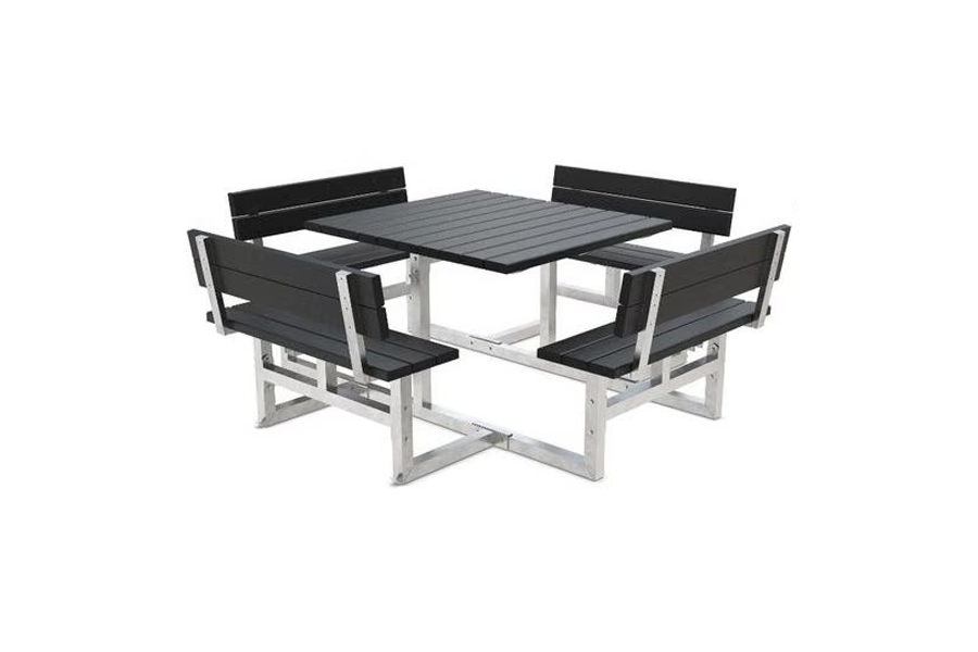 Stabilt piknikbord med plass til 8 personer, 2 på hver benk. Utstyrt med ryggstøtte for økt komfort. Benker, ryggstøtte og bord er laget av holdbar plast og har en robust ramme av galvanisert stål. Perfekt for å skape en innbydende samlingsplass i hagen, bakgården eller på uteplassen, hvor du kan nyte utendørslivet med familie og venner